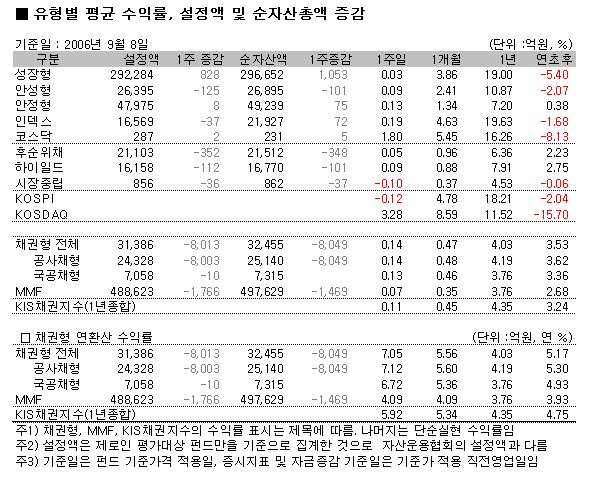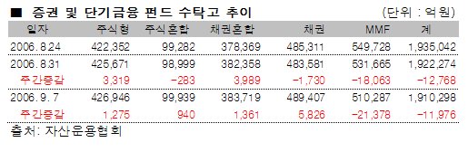 한편 자산운용협회에 따르면 한 주간 증권 및 단기금융 펀드 수탁고는 총 1조1976억원이 감소한 191조298억을 기록했다. 단기금융 펀드를 제외한 다른 증권 펀드에서는 모두 전주대비 소폭 증가세를 나타냈지만 MMF에서 2조1378억원의 자금이 빠져나가면서 전체 수탁고에 악영향을 끼쳤다.
