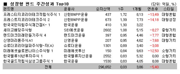 성장형 펀드 179개 가운데 신한BNP운용의 `프레스티지코리아테크적립식주식1`과 `프레스트지코리아테크주식2`가 주간 각각 1.72%, 1.39%의 수익률로 주간순위 1, 2위를 차지했다. 이 펀드들은 NHN(4.30%), SK텔레콤(5.08%), 삼성테크윈(5.79%), CJ인터넷(8.74%)등 주간 상승폭이 컸던 종목들 덕분에 좋은 성과를 낼 수 있었던 것으로 분석됐다.