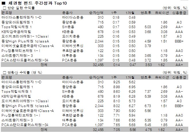 채권펀드 47개 중 `마이다스롱런채권자1-D` 펀드와 `동양모아드림채권1` 펀드가 각각 주간 0.18%(연 9.25%), 0.17%(연 8.98%)의 수익률을 기록해 주간성과 1,2위를 차지했다.