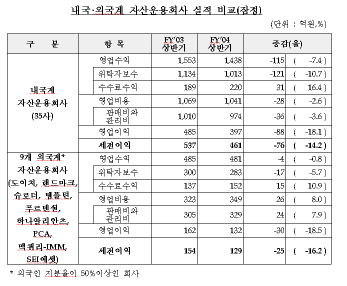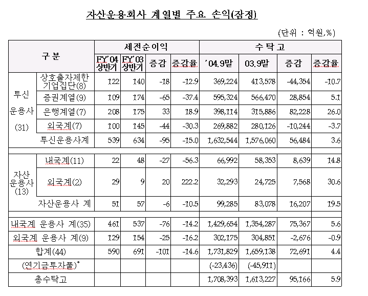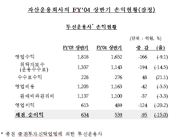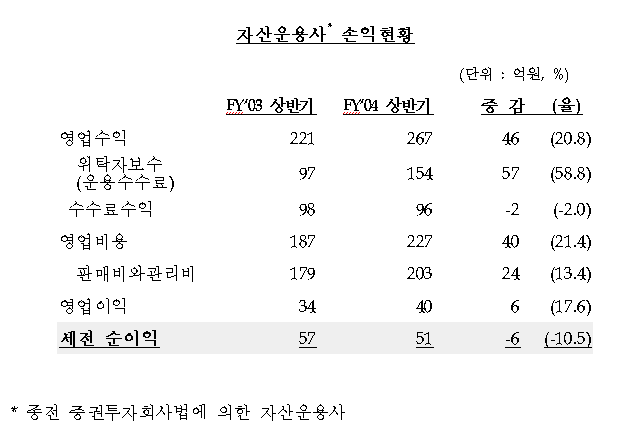 금융감독원이 자산운용회사의 2004회계년도 상반기(’04.4.1~9.30) 영업보고서를 제출한 44개 자산운용사*의 영업실적을 집계한 결과, 세전이익은 590억원으로 전년동기(691억원) 대비 101억원 감소(△14.6%)한 것으로 나타났다.