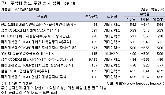 코스피200 성과의 1.5배 이상을 추종하는 레버리지펀드와 화학업종 관련 상장지수펀드(ETF)가 주간성과 상위펀드에 기록됐다. 반면 한 주간 -6.04%의 수익률을 기록한 은행주의 여파로 금융 관련 테마펀드는 주간성과 하위권에 머물렀다.