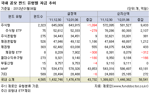 6일 현재, 제로인 유형분류기준으로 펀드자금 동향을 조사한 결과, 국내 공모펀드 설정액은 MMF의 대규모 자금유출로 한 주간 7조 9,513억원 감소한 143조 2,746억원, 순자산액은 7조 8,365억원 감소한 138조 9,799억원으로 집계됐다.