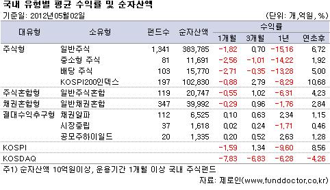 펀드평가사 제로인(www.FundDoctor.co.kr)이 5월 2일 공시 기준가격으로 2012년 4월 한달간 펀드수익률을 조사한 결과 국내주식형 펀드의 평균 수익률은 -1.25%를 기록했다.