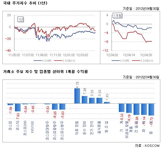 상승 모멘텀이 부재한 상황에서 국내외 주요 기업의 양호한 어닝발표에도 불구, 4월 역시 경기 둔화를 비롯한 리스크 요인들이 서로 맞물리며 부진한 주가 흐름이 지속됐다. 스페인 재정위기가 불거진 가운데 미국 고용 및 주택지표 마저 부진했던 것이 투자심리를 악화시켰다. 이에 4월 한달간 코스피지수는 전달보다 1.59% 하락했으며, 코스닥 지수는 -7.83%로 큰 폭으로 하락했다.