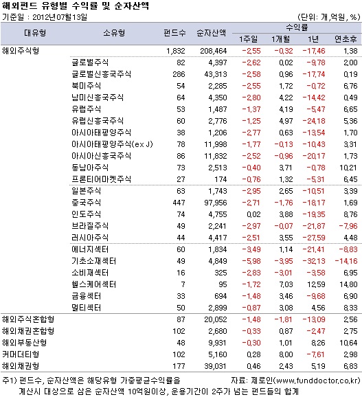 펀드평가사 제로인(www.FundDoctor.co.kr)이 7월 13일 아침 공시된 기준가격으로 펀드수익률을 조사한 결과, 해외주식형펀드는 한 주간 -2.55%의 수익률을 기록했다. 전주 3.58% 상승하며 기대감을 모았지만 한 주 만에 하락 반전했다. 특히 지난주 5% 이상 상승했던 브라질 및 남미신흥국주식펀드가 금주에는 다른 지역권 펀드에 비해 하락폭이 컸으며 일본주식펀드와 중국주식펀드도 2% 후반대의 손실을 기록했다.