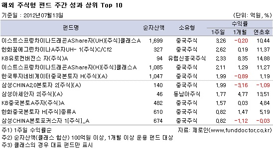 순자산액(클래스 합산) 100억 원 이상, 운용기간 1개월 이상인 1,072개 해외주식형펀드 중 154개 펀드만이 플러스 수익률을 기록했다. 중국 본토 주식에 투자하는 펀드가 성과 상위펀드에 대부분 자리했다.
