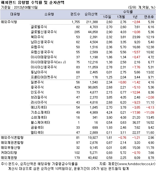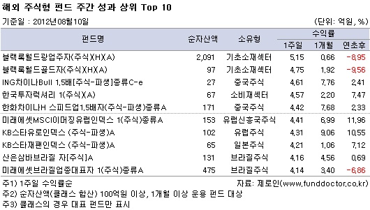 펀드평가사 제로인(www.FundDoctor.co.kr)이 8월 10일 아침 공시된 기준가격으로 펀드수익률을 조사한 결과, 해외주식형펀드는 한 주간 2.60%의 수익률을 기록했다. 개별국가 펀드 중 브라질주식펀드가 국제 원자재 가격 상승으로 인해 가장 높은 성과를 기록했고 이머징국가 증시의 강세 여파로 글로벌신흥국주식펀드가 뒤를 이었다. 섹터펀드 중에서는 원자재 가격과 연관성이 높은 기초소재섹터 펀드의 성과가 가장 좋았고 그 뒤를 소비재섹터 펀드가 이었다.