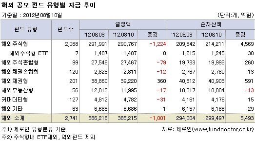 제로인 분류 기준으로 공모 해외펀드(역외펀드 제외) 설정액은 전주보다 1,001억원이 줄어든 38조 5,215억원으로 집계됐다.