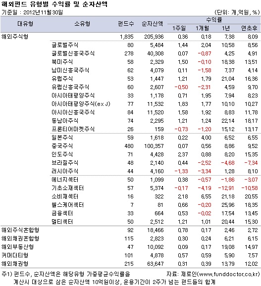 펀드평가사 제로인(www.FundDoctor.co.kr)이 30일 아침 공시된 기준가격으로 펀드수익률을 조사한 결과, 해외주식펀드는 한 주간 0.36% 상승했다. 그리스 구제금융 합의와 미국 경제 지표 개선이 호재였으나 미국 재정절벽 우려와 중국본토 주식의 저조한 성과가 상승을 제한했다.