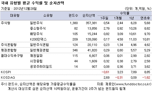 펀드평가사 제로인(www.Funddoctor.co.kr)이 28일 아침 공시된 기준가격으로 펀드 수익률을 조사한 결과, 국내주식형 전체 수익률은 한 주간 0.37% 상승했다. 동기간 코스피지수는 미국 재정절벽 협상에 대한 불안감으로 0.61% 하락했고, 새정부의 중소기업 육성 발언이 호재로 작용하며 코스닥지수는 2.69% 상승했다.