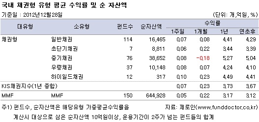 주간성과 상위권에는 듀레이션이 긴 중기채권펀드가 자리했고, 하위권에는 초단기채권펀드와 우량채권펀드가 자리했다.