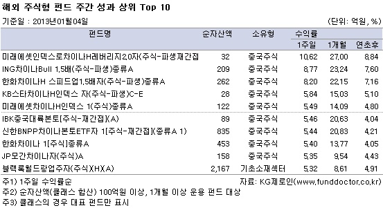 순자산액(클래스 합산) 100억원 이상, 운용기간 1개월 이상인 1,063개 해외주식형펀드 중 1,057개 펀드가 플러스 성과를 기록했다. 성과 상위 펀드는 중국주식펀드가 대부분이었고 기초소재섹터펀드 또한 성과 상위 펀드에 자리했다.