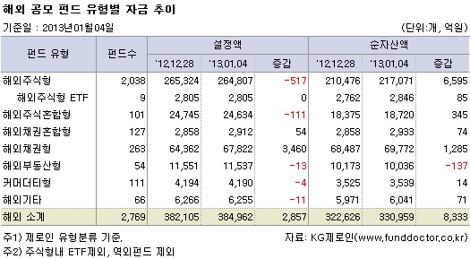 KG제로인 분류 기준으로 공모 해외펀드(역외펀드 제외) 설정액은 4일 현재 38조 4,962억원으로, 전주 대비 2,857억원 증가했다. 순자산액은 8,333억원 증가한 33조 959억원으로 집계됐다.