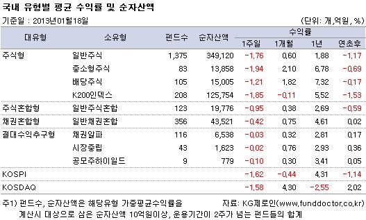 펀드평가사 KG제로인(www.Funddoctor.co.kr)이 18일 아침 공시된 기준가격으로 펀드 수익률을 조사한 결과, 국내주식형 전체로는 한 주간 1.87% 하락했다. 같은 기간 원화 강세로 국내 기업의 실적 악화 우려가 커지며 코스피지수는 1.62% 하락했다. 세계 최대 상장지수펀드 운용사인 뱅가드가 운용펀드의 벤치마크를 MSCI EM지수에서 한국이 빠진 FTSE EM지수로 변경하면서 외국인의 투자자금 이탈이 커진것도 국내증시에 부정적이었다. 중소형주식펀드가 -1.94%로 가장 부진했고, K200인덱스 펀드도 -1.85%로 저조했다. 일반주식펀드도 -1.76%의 수익률을 기록했다.