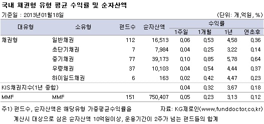 보유채권의 듀레이션이 긴 중기채권펀드의 주간 수익률이 0.10%로 가장 높았다. 일반채권펀드는 0.06%를 기록했고, 초단기채권펀드와 우량채권펀드는 모두 0.04%의 수익률을 기록했다. 반면 투자적격등급(BBB) 이하 채권 및 어음과 후순위채권 등에 투자하는 하이일드채권펀드가 0.01%로 가장 낮았다.