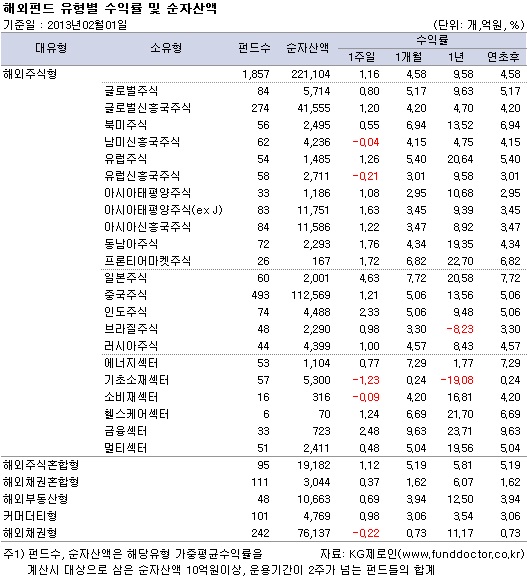 펀드평가사 KG제로인(www.FundDoctor.co.kr)이 1일 아침 공시된 기준가격으로 펀드수익률을 조사한 결과, 해외주식펀드는 한 주간 1.16% 상승했다. 엔화 약세로 일본주식펀드가 가장 성과가 좋았고 주요국 은행주 강세로 금융섹터펀드 성과도 상위권에 올랐다.