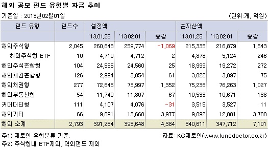 KG제로인 분류 기준으로 공모 해외펀드(역외펀드 제외) 설정액은 2월 1일 현재 39조 5,648억원으로, 한 주간 4,384억원 늘었다. 순자산액은 수익률 상승에 7,101억원 증가한 34조 7,712억원으로 집계됐다.