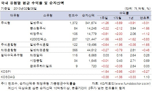 펀드평가사 KG제로인(www.FundDoctor.co.kr)이 2월 8일 아침 공시된 기준가격으로 펀드 수익률을 조사한 결과, 국내주식형펀드는 한주간 1.27% 하락했다. 5주 연속 약세 행진 속에서 처음으로 코스피 수익률을 상회하는 성과를 보였다. 대형주 중심의 포트폴리오와 펀드에서의 자금이탈로 벤치마크를 하회한 성과를 보여왔지만, 2월들어 펀드 환매가 잦아들며 안정을 찾고 있다.