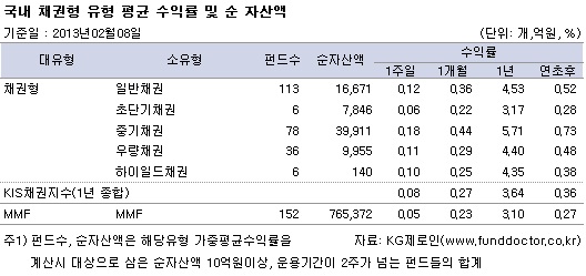 시장금리 하락에 국내채권펀드는 한주간 0.14% 오르며 직전 주 하락을 모두 만회, 연초 후 수익률은 0.60%로 올라섰다. 특히 중기채권펀드는 한주간 0.18% 급등했다.