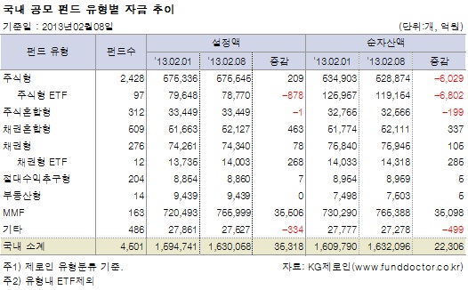 2월 8일 현재, KG제로인 유형분류 기준으로 펀드자금 동향을 조사한 결과, 국내 공모펀드 설정액은 한 주간 3조 5,318억원 증가한 163조 58억원으로 집계됐다.