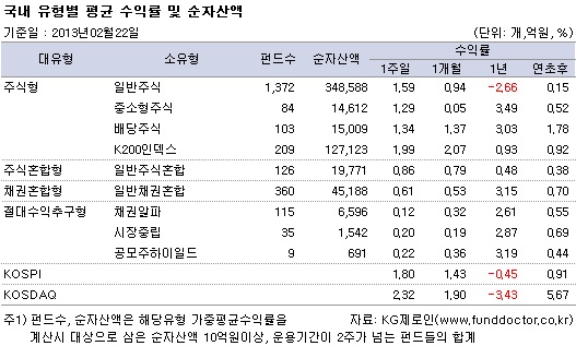 펀드평가사 KG제로인(www.FundDoctor.co.kr)이 2월 22일 아침 공시된 기준가격으로 펀드 수익률을 조사한 결과, 국내주식형펀드는 한주간 1.68% 상승했다. 지난주 뉴욕증시에서 구글의 주가가 5년만에 처음으로 800달러를 돌파한 것이 IT주의 상승세로 이어지고 엔화 약세 진정은 국내 자동차 주가의 호재로 작용했다. IT와 자동차 업종 강세로 대형주에 주로 투자하는 K200인덱스펀드가 한주간 1.99% 상승해 가장 높은 수익률을 기록했다.