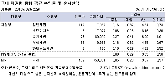 채권시장이 강세를 보이면서 보유채권의 듀레이션이 긴 중기채권펀드가 0.27%로 가장 높은 수익률을 기록했다. 일반채권펀드와 우량채권펀드가 모두 0.16% 상승해 그 뒤를 이었다. 투자적격등급(BBB)이하 채권 및 어음과 후순위채에 투자하는 하이일드채권펀드가 0.10%를 기록했다. 채권금리 인하 폭이 적었던 초단기채권펀드는 0.06% 상승에 그쳤다.