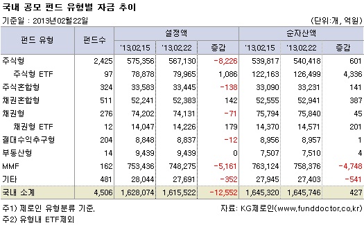 2월 22일 현재, KG제로인 유형분류 기준으로 펀드자금 동향을 조사한 결과, 국내 공모펀드 설정액은 한 주간 1조 2,552억원 감소한 161조 5,522억원, 순자산액은 427억원 증가한 164조 5,746억원으로 집계됐다.