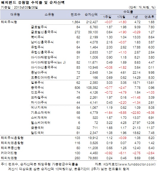 펀드평가사 KG제로인(www.FundDoctor.co.kr)이 8일 아침 공시된 기준가격으로 펀드수익률을 조사한 결과, 해외주식펀드는 한 주간 0.07% 하락했다. 미국과 유럽의 경기회복에 대한 기대감으로 북미주식펀드와 유럽주식펀드가 상승 전환했다.