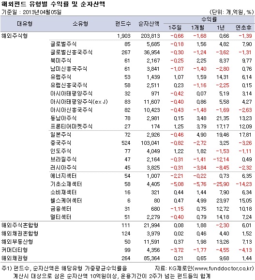 펀드평가사 KG제로인(www.FundDoctor.co.kr)이 5일 아침 공시된 기준가격으로 펀드수익률을 조사한 결과, 해외주식펀드는 한 주간 -0.66%를 기록했다. 미국 경제 지표 부진이 악재로 작용하였지만, 키프로스 구제금융이 해결되는 조짐을 보이며 유럽증시가 상승반전 했다.