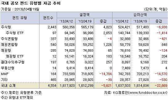 4월 19일 현재, 제로인 유형분류 기준으로 펀드자금 동향을 조사한 결과, 국내 공모펀드 설정액은 한 주간 5,621억원 감소한 161조 2,299억원으로 집계됐다. 지수 하락으로 순자산액은 2조 2,669억원 감소했다.