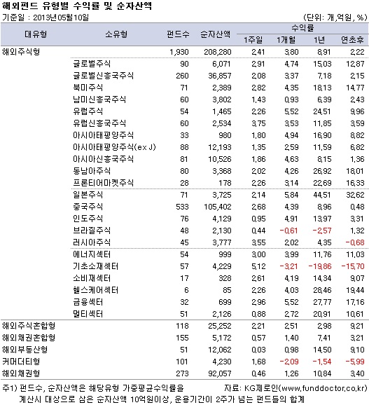 펀드평가사 KG제로인(www.FundDoctor.co.kr)이 10일 아침에 공시된 기준가격으로 펀드수익률을 조사한 결과, 해외주식펀드는 한 주간 2.41% 상승했다. 소유형 기준, 개별국가 및 권역을 비롯한 모든 유형의 해외주식펀드가 플러스 성과를 기록하며 강세를 나타냈다.