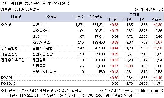 펀드평가사 KG제로인(www.Funddoctor.co.kr)이 5월 24일 오전 공시된 기준가격으로 펀드 수익률을 조사한 결과, 국내주식형 전체로는 한 주간 0.93% 하락했다. 코스피지수가 0.89% 하락한 가운데 대부분의 유형이 마이너스를 기록했다. 중국경기 둔화우려로 국내 정유화학, 철강 등 중국 관련 대형주들이 약세를 보여 K200인덱스펀드가 -0.89%로 가장 낮았다. 일반주식펀드와 중소형주식펀드는 -0.82%, -0.17%의 수익률을 기록했다. 경기방어주에 투자하는 비중이 높은 배당주식펀드만이 0.54%의 수익률로 유일하게 플러스 성과를 보였다.