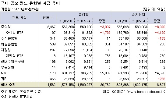 5월 24일 현재, KG제로인 유형분류 기준으로 펀드자금 동향을 조사한 결과, 국내 공모펀드 설정액은 한 주간 2조 769억원 증가한 159조 9,227억원으로 집계됐다. 순자산액은 1조 3,307억원 증가한 162조 2,175억원으로 집계됐다. MMF로의 자금 유입이 전체 설정액 및 순자산 증가의 대부분을 차지했다.