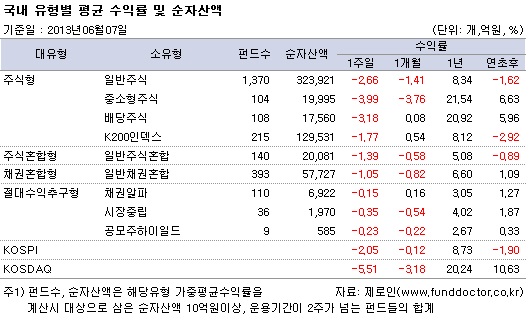 펀드평가사 KG제로인(www.Funddoctor.co.kr)이 6월 7일 오전 공시된 기준가격으로 펀드 수익률을 조사한 결과, 국내주식형 전체로는 한 주간 2.43% 떨어지며 연초 이후 수익률이 다시 마이너스로 돌아섰다. 기관들의 바이오주 순매도가 이어지면서 중소형주식펀드는 -3.99%의 수익률로 주식형 중 가장 부진한 모습을 보였다. 일반주식펀드와 배당주식펀드도 각각 2.66%, 3.18% 하락했다. K200인덱스펀드마저 1.77% 하락하며 모든 주식형펀드가 마이너스 수익률을 기록했다.