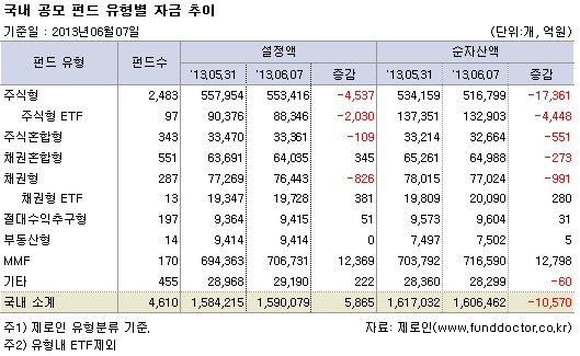 6월 7일 현재, 제로인 유형분류 기준으로 펀드자금 동향을 조사한 결과, 국내 공모펀드 설정액은 한 주간 5,865억원 증가한 159조 79억원, 순자산액은 1조 570억원 감소한 160조 6,462억원으로 집계됐다.