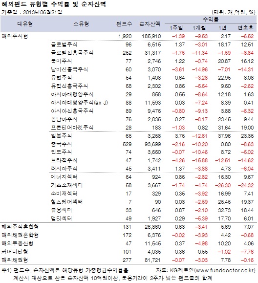 펀드평가사 KG제로인(www.FundDoctor.co.kr)이 21일 오전에 공시된 기준가격으로 펀드수익률을 조사한 결과, 해외주식펀드는 한 주간 0.22% 하락했다. 지역별로는 브라질과 중국 등이 전주에 이어 연속하락 했다.