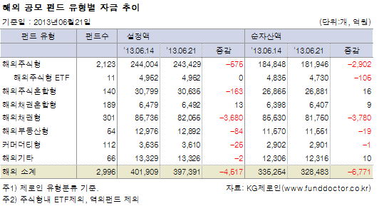 미 연방공개시장위원회(FOMC)를 앞두고 관망세를 보이던 해외증시는 벤 버냉키 미국 연방준비제도이사회(FRB) 의장의 연내 양적완화 규모 축소와 내년 중단 계획 발표에 일제히 하락했다. 이에 해외주식펀드는 6주 연속 하락세를 나타냈다.