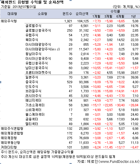 펀드평가사 KG제로인(www.FundDoctor.co.kr)이 7월 1일 공시된 기준가격으로 상반기 해외주식형펀드 수익률을 조사한 결과 6개월 동안 -6.65%의 수익률을 기록했다.