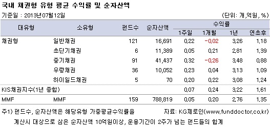 보유채권의 듀레이션이 긴 중기채권펀드가 주간 0.32%로 가장 높은 수익률을 기록했다. 우량채권펀드가 0.23%로 그 뒤를 이었고, 일반채권펀드는 0.22%를 기록했다. 투자적격등급(BBB) 이하 채권 및 어음과 후순위 채권 등에 투자하는 하이일드채권펀드 수익률은 0.20%였다. 초단기채권펀드는 0.05% 상승했다.