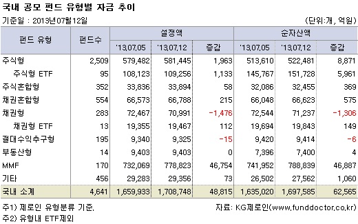12일 현재, KG제로인 유형분류기준으로 펀드자금 동향을 조사한 결과, 국내 공모펀드 설정액은 4조 8,815억원 증가한 170조 8,748억원, 순자산액은 6조 2,565억원 증가한 169조 7,585억원으로 집계됐다. MMF로 4조원이 넘는 자금이 유입됐고, ETF를 제외한 채권형과 절대수익형에서는 자금이 유출됐다.