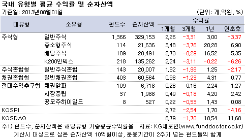 펀드평가사 KG제로인(www.FundDoctor.co.kr)이 8월 1일 공시 기준가격으로 2013년 7월 펀드수익률을 조사한 결과 국내주식형 펀드의 평균 수익률은 2.52%로 나타났다. 7월 한 달간 국내증시의 상승 모멘텀에 힘입어 국내주식형 펀드는 모든 유형에서 플러스 수익률을 기록했다.
