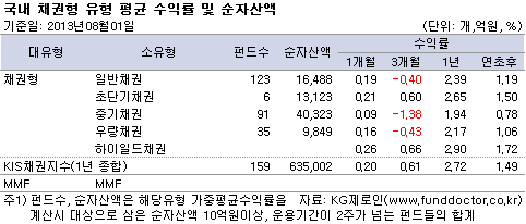 펀드평가사 KG제로인(www.FundDoctor.co.kr)이 8월 1일 공시 기준가격으로 2013년 7월 펀드수익률을 조사한 결과 국내채권형 펀드의 평균 수익률은 0.13%로 나타났다.