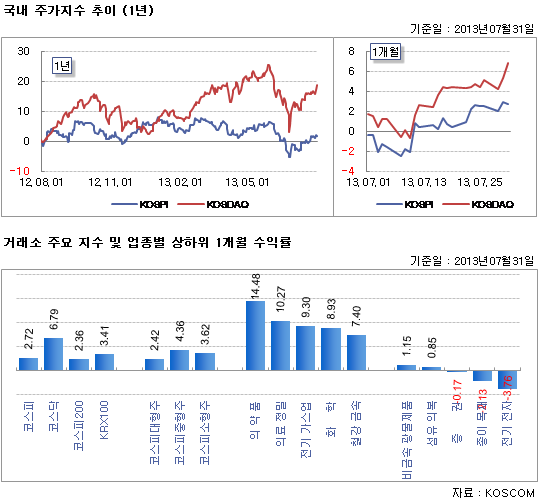 벤 버냉키 미국 연준 의장의 의회 발언으로 양적완화 조기종료 우려 감소, 유로존의 경기 회복 조짐 및 중국의 신용 리스크 완화 등이 국내 주식시장에 영향을 미치며, 7월 한 달 코스피는 2.72% 상승했다.