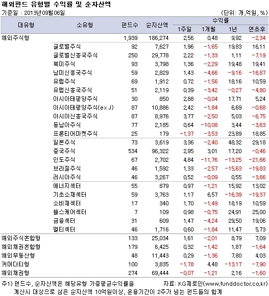 펀드평가사 KG제로인(www.FundDoctor.co.kr)이 9월 6일 오전 공시된 기준가격으로 펀드수익률을 조사한 결과, 해외주식펀드는 한 주간 2.56% 상승하며 전주의 부진에서 벗어나는 모습을 보였다. 지역별로는 프론티어마켓을 제외한 모든 지역에서 양호한 성과를 나타냈다.