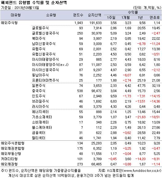 최근 발표된 중국의 실물경제지표들이 전망치를 상회하며 경기회복 기대감이 고조되면서 해외주식형 펀드 수익률은 상승했다. 시리아 공습 우려 또한 완화되는 모습을 보이며 상승폭을 확대시켰다.