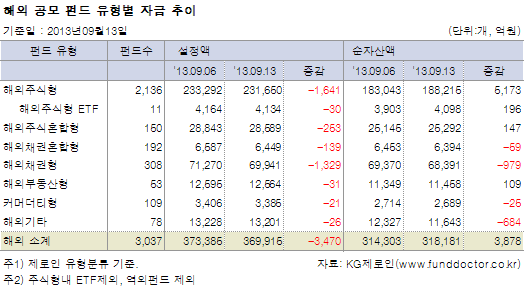 KG제로인 분류 기준으로 공모 해외펀드(역외펀드 제외) 설정액은 13일 현재 36조 9,915억원으로, 전주 대비 3,470억원 줄었다. 반면 순자산액은 3,878억원 증가한 31조 8,181억원으로 집계됐다.