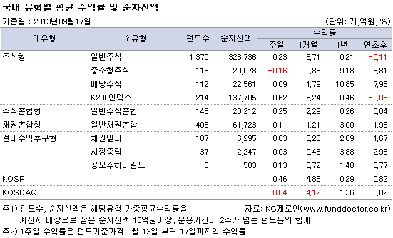 펀드평가사 KG제로인(www.Funddoctor.co.kr)이 17일 오전 공시된 기준가격으로 펀드수익률을 조사한 결과, 국내주식형 펀드는 한 주간(2013.09.13~09.17) 0.33% 상승했다. 대형주를 중심으로 외국인 매수세가 지속됨에 따라, 대형주 위주의 KOSPI200을 추종하는 K200인덱스펀드가 0.62%의 수익률로 가장 높은 성과를 기록했다.