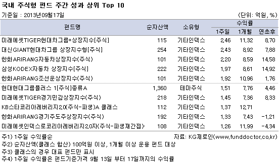 국내주식형 펀드 주간 성과 상위권에는 모두 기타인덱스형이 차지했다. 현대차, 현대모비스, 기아차 등 현대•기아자동차그룹 종목과 관련된 상장지수펀드들이 대거 눈에 띄며, 이번주 현대차그룹 펀드들이 우수한 모습을 보였다