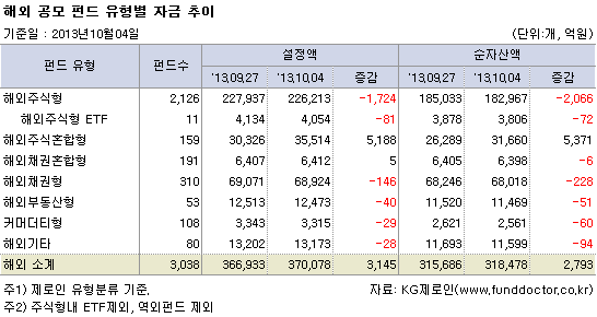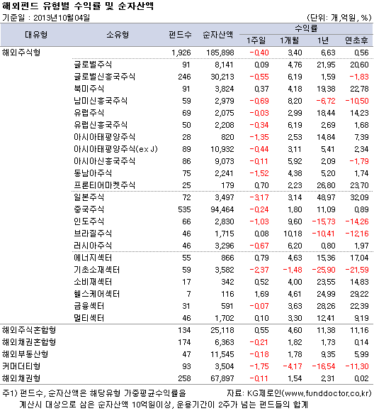 펀드평가사 KG제로인(www.FundDoctor.co.kr)이 10월 4일 오전 공시된 기준가격으로 펀드수익률을 조사한 결과, 해외주식펀드는 한 주간 0.40% 하락했다. 대부분의 유형에서 마이너스 수익률을 기록했으며, 해외주식펀드의 자금유출이 중국주식펀드를 비롯한 신흥국주식펀드에서 강하게 일어났다.