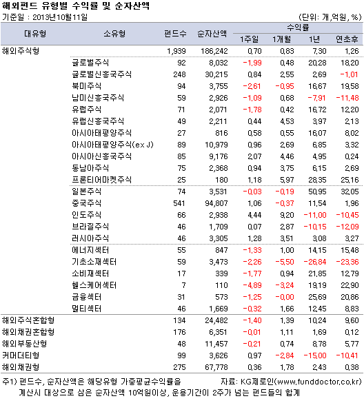 미국 연방정부의 셧다운 여파로 글로벌 금융시장의 불확실성이 지속되었지만 인도, 중국을 중심으로 한 아시아 신흥국의 경기회복 기대 속에 해외주식형 펀드 수익률은 플러스 수익률을 보이며 3주만에 반등에 성공했다.